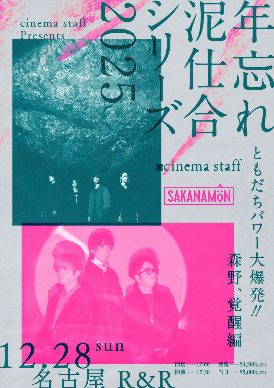 【イベント名】 cinema staff Presents 年忘れ泥仕合シリーズ2025 ともだちパワー大爆発!!森野、覚醒編 【会場】 CLUB ROCK’N’ROLL 【時間】 OPEN 17:00 / START 17:30 【出演】 cinema staff SAKANAMON 【チケット】 前売り:4,500円(D代別) <オフィシャル先行> ぴあ:https... MORE