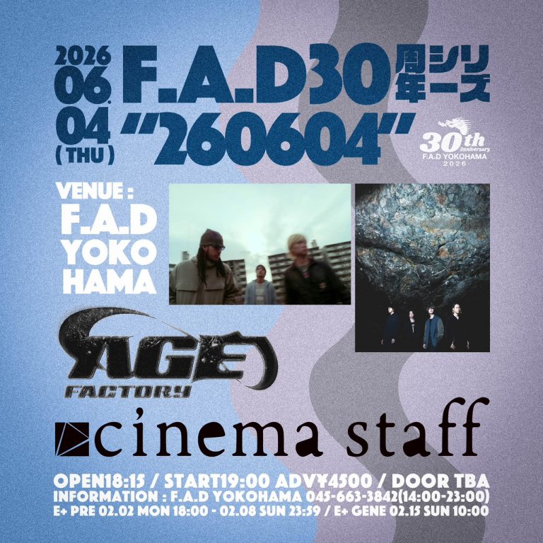【イベント名】 F.A.D30周年シリーズ “260604” 【会場】 F.A.D YOKOHAMA 【時間】 OPEN 18:15 / START 19:00 【出演】 Age Factory cinema staff 【チケット】 前売り:4,500円(D代別) ※小学生以上チケット必要 ※未就学児入場不可 〈プレオーダー先行抽選〉 e+:https://eplus.jp/sf/detai... MORE