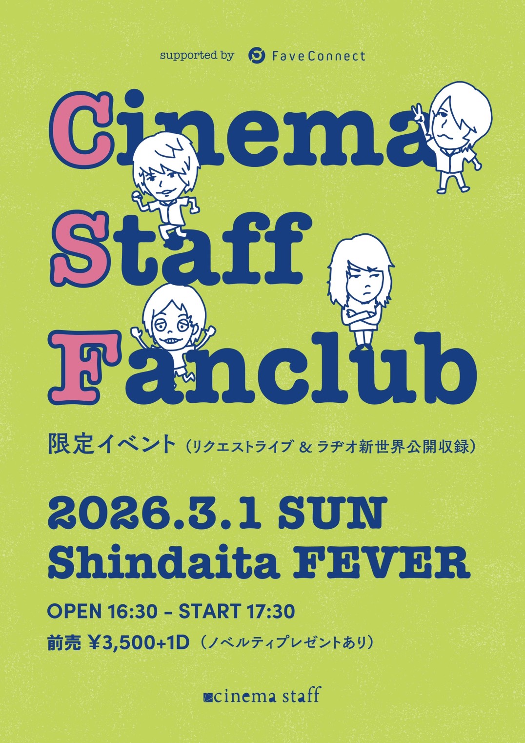 【イベント名】 CINEMA STAFF FANCLUB 限定イベント (ライブ&ラヂオ新世界公開収録) 【会場】 新代田FEVER 【時間】 OPEN 16:30 / START 17:30 【出演】 cinema staff 【チケット】 前売り:3,500円(D代別) 〈申込期間〉 1/9(金)21:00〜 詳細はFCサイトをご覧ください。 https://cinemastaf... MORE