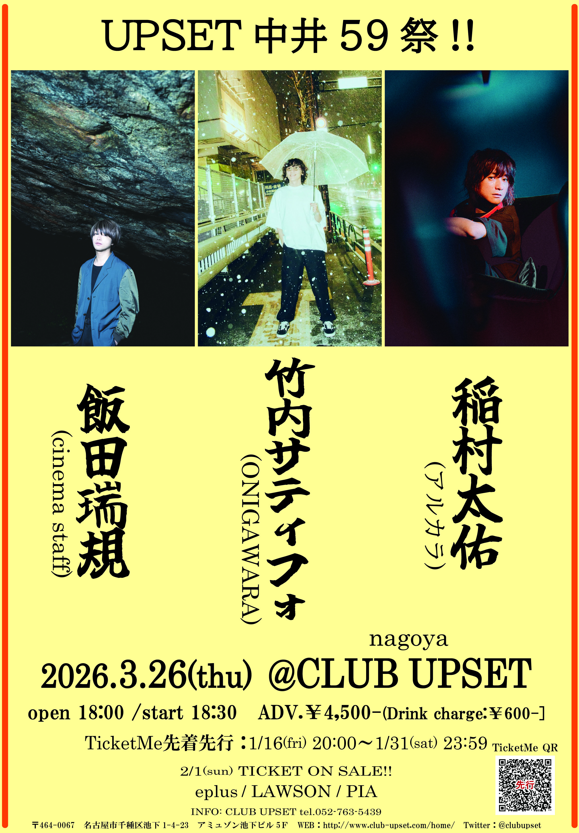 【イベント名】 UPSET中井59祭!! 【会場】 名古屋CLUB UPSET 【時間】 OPEN 18:00 / START 18:30 【出演】 飯田瑞規(cinema staff) 竹内サティフォ(ONIGAWARA) 稲村太佑(アルカラ) 【チケット】 前売り:4,500円(D代別) 〈先行 (先着)〉 TicketMe:ttps://x.gd/njG1c 受付期間:1月16日(金) ... MORE