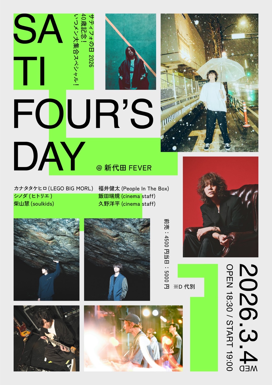 【イベント名】 サティフォの日2026 40歳記念!いつメン大集合スペシャル! 【会場】 新代田FEVER 【時間】 OPEN 18:30 / START 19:00 【出演】 竹内サティフォ (ゲスト) カナタタケヒロ(LEGO BIG MORL) シノダ(ヒトリエ) 柴山慧(soulkids) 福井健太(People In The Box) 飯田瑞規(cinema staff) 久野洋平(cinema staff) ... MORE